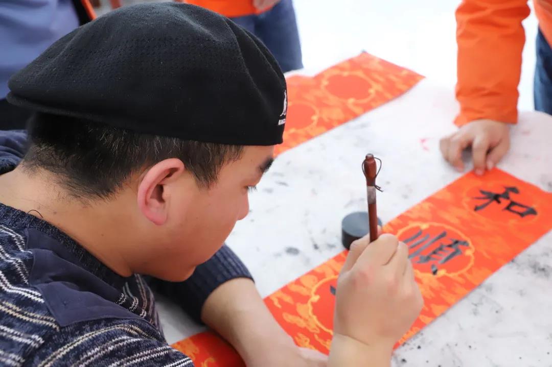 筆走龍蛇間,一張張筆酣墨飽、寓意吉祥的“福”字、春聯躍然紙上。集團各單位書法愛好者和員工們早早來到書寫現場,一邊幫著鋪紙調墨,一邊井然有序地向書法家們“求”取自己中意的春聯和美好祝福。兩個多小時,書法家們共寫出了200余幅作品,并現場講解釋義、互動交流,活動現場鋪滿了春聯和福字,形成了一片熱鬧非凡的紅色海洋。