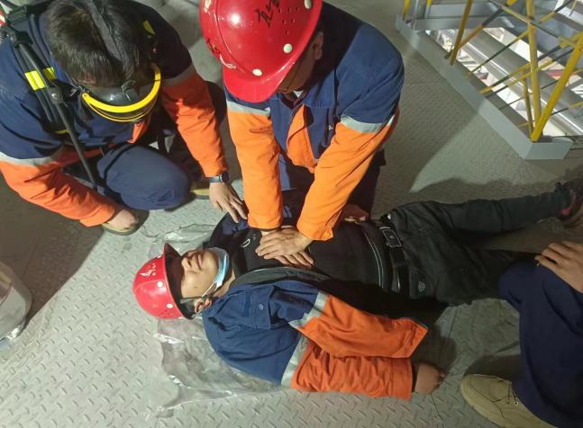 本次演練模擬化工熱電公司35T2#鍋爐床溫熱電偶被床料沖刷時,檢修工作人員進入爐膛檢查熱電偶測量端時,發生爐膛窒息事故,導致檢修人員昏迷倒地,情況十分危急。事故發生后,化工熱電公司立即啟動應急預案,在總指揮的調度下,現場搶險組攜帶測氧儀并戴好正壓式氧氣呼吸器,對檢修窒息人員組織搶救,將其抬出爐膛并進行心肺復蘇和人工呼吸,使窒息人員逐漸恢復呼吸與心跳。整個演練歷時1小時。