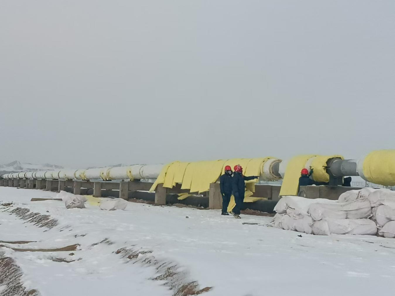入冬以來的第二場雪,使得項目建設的難度達到新的高度。面對晝夜零下十幾度的嚴峻天氣考驗,現場施工隊伍決定在管道基礎制作期間,采用混凝土分段澆筑的方式有序施工。白天氣溫相對高的時候進行澆筑,每段澆筑完成后及時搭設保溫棚,夜間在保溫棚內部生火,避免混凝土受凍,確保其強度達到要求。