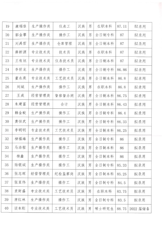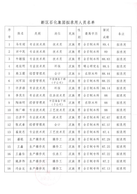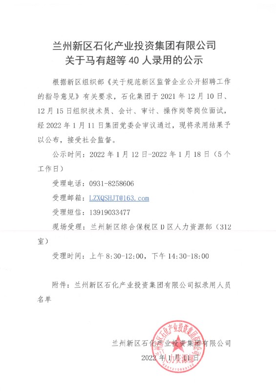 蘭州新區石化產業投資集團有限公司關于馬有超等40人錄用的公示
