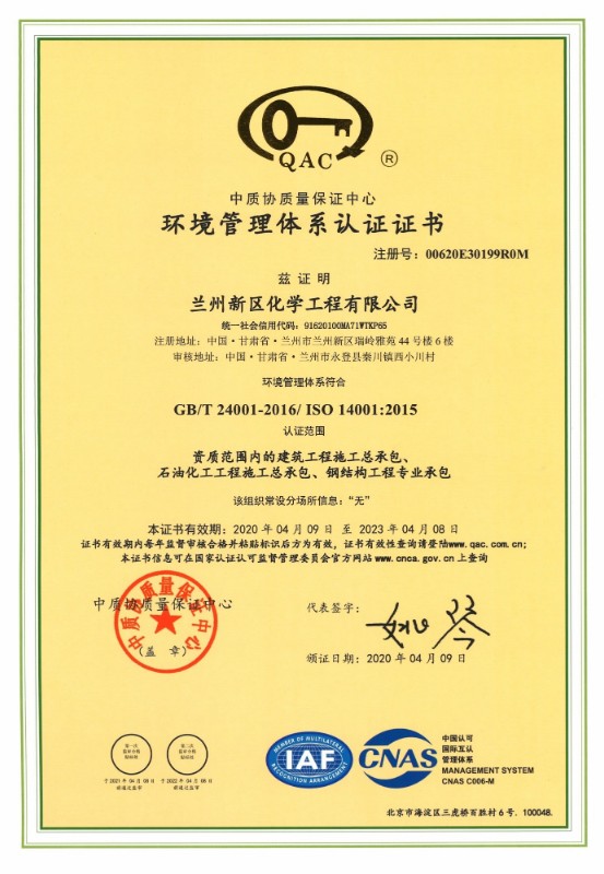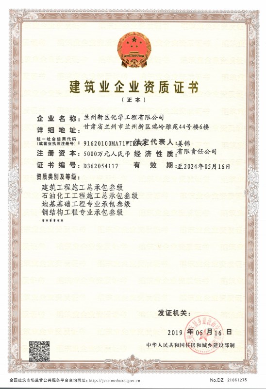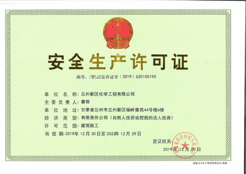 蘭州新區化學工程有限公司目前已取得了石油化工總承包三級、建筑工程總承包三級、鋼結構專業承包三級、地基處理專項承包三級資質。
