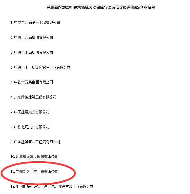 近日,從蘭州新區民政司法和社會保障局獲悉,蘭州新區化學工程有限公司被認定為蘭州新區2020年建筑領域勞動保障守法誠信等級評價A級企業,成為蘭州新區唯一一家獲得此榮譽的新區國有企業。