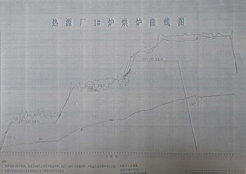 此次烘爐采用帶壓烘爐的方式,在點火風道等處共布置6臺烘爐機,鍋爐升溫分為三個階段,分別是:常溫~110℃、110~250℃及250~350℃,烘爐完成后按照溫度小于30℃/h降溫冷卻。由于內襯材料密度高、厚度大,水分析出需均勻緩慢,精準的溫度控制是烘爐成功的關鍵,熱源廠運行人員24小時輪班作業,嚴密監控和采集實時數據,對數據進行分析比對和測算,并根據運行現狀和發展趨勢適時調整油壓和風油配比,使溫升速率和預設曲線相吻合,游離偏差控制在±30℃以內。