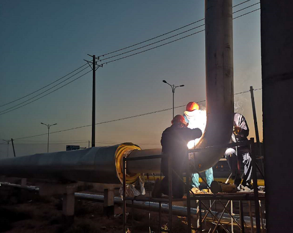 熱力管網(wǎng)一期項目位于蘭州新區(qū)綠色化工園區(qū)南區(qū)塊,由蘭州新區(qū)化學工程有限公司承建,主要負責為園區(qū)企業(yè)提供生產(chǎn)所需的蒸汽及采暖所需的熱水。該項目主管網(wǎng)已于2019年11月全線貫通,并投入使用。后期因新入園企業(yè)的增加,導致原管線預留口及企業(yè)門頭桁架發(fā)生變更需改遷。為了不影響園區(qū)企業(yè)生產(chǎn)運營,石投集團經(jīng)過多方協(xié)調,商定于9月29日早上七點停汽。此次熱力管網(wǎng)管道改遷工作任務緊,難度大,工程公司迎難而上,通過前期對圖紙的精研,科學組織,精準施策,經(jīng)過15個小時連續(xù)奮戰(zhàn),最終完成6座企業(yè)門頭桁架蒸汽管道的改遷、6處新增蒸汽預留接口的安裝及2處DN400旋轉補償器位置的變更。