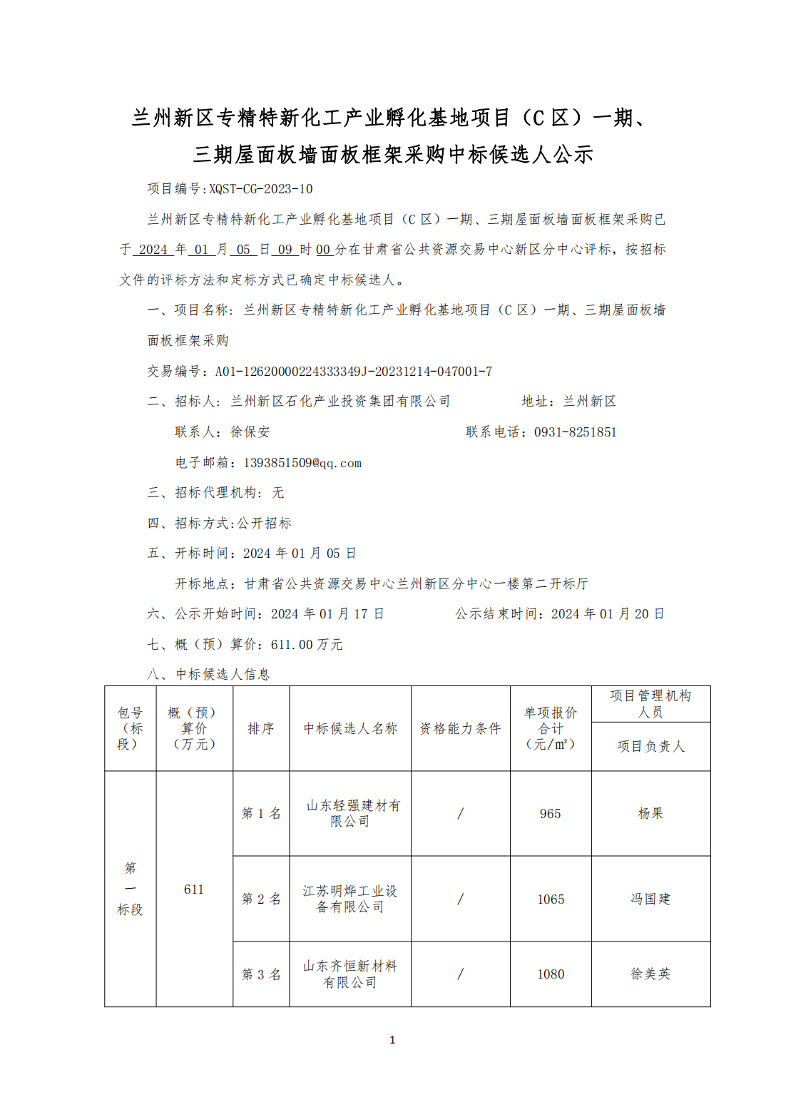 蘭州新區專精特新化工產業孵化基地項目(C 區)一期、 三期屋面板墻面板框架采購中標候選人公示
