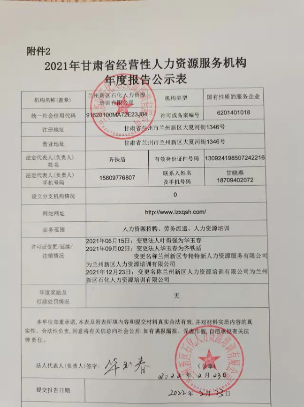 根據甘肅省人力資源和社會保障廳《關于開展2021年度全省經營性人力資源服務機構年度報告公示工作的通知》(甘人社通〔2022〕44號)文件要求,現對蘭州新區石化人力資源培訓有限公司2021年度報告進行公示,接受社會監督。詳見年度報告公示表。