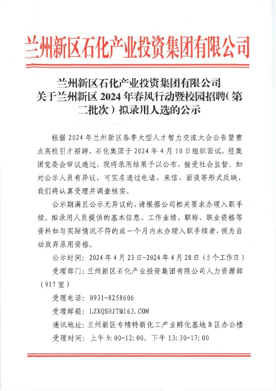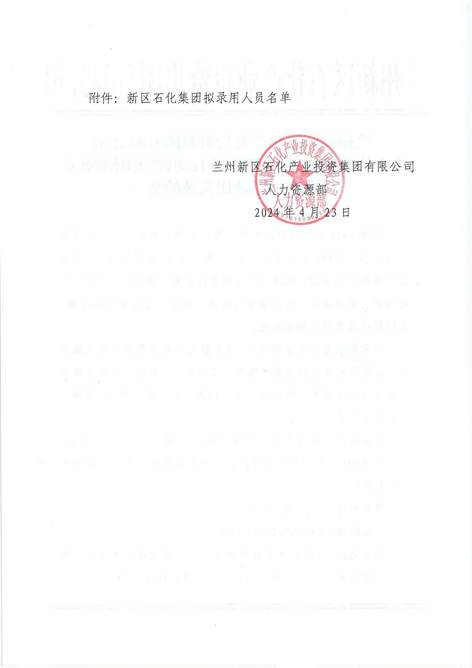 蘭州新區石化產業投資集團有限公司 關于蘭州新區2024年春風行動暨校園招聘(第二批次)擬錄用人選的公示